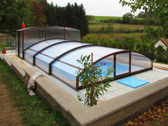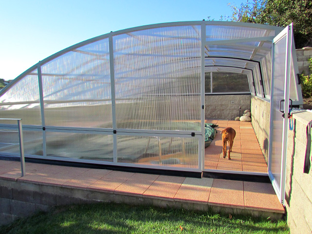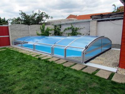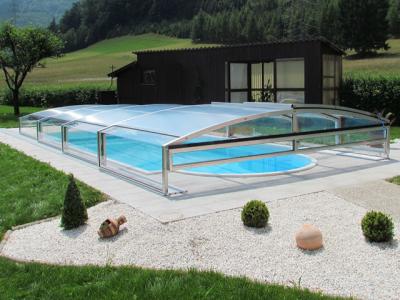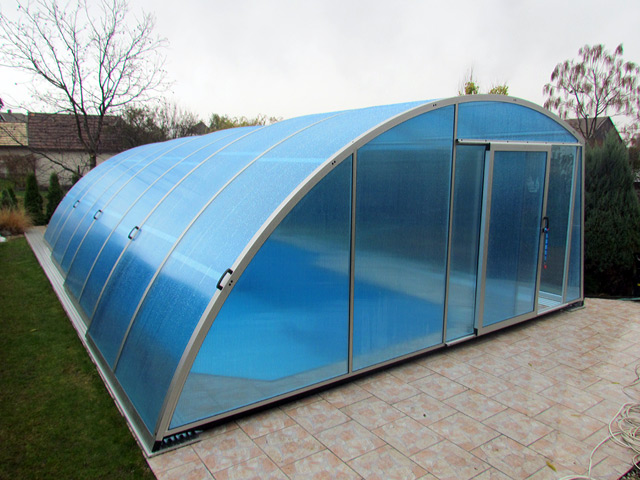 Elegantný tvar zastrešenia zaisťuje plnohodnotnú ochranu bazéna, vďaka optimálnej klenbe môžete bazén spokojne využívať i v zakrytom stave počas nepriaznivého počasia.